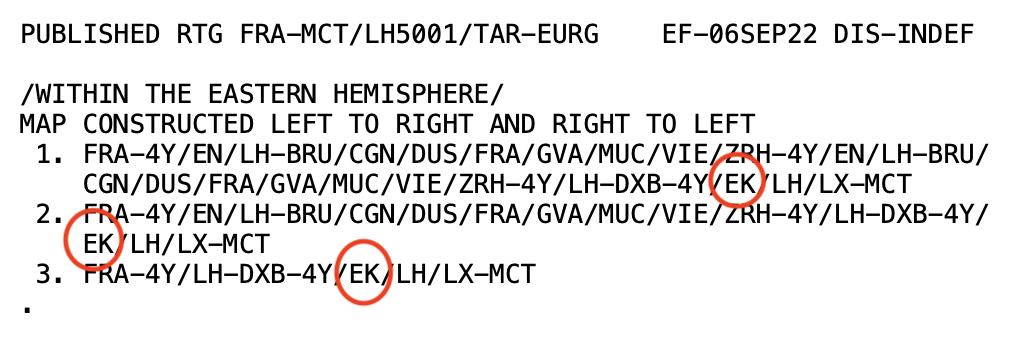 Man sollte sich bei dem hohen Preis nicht irritieren lassen, denn dieser liegt an dem Lufthansa Flug nach Dubai, der sehr gut gebucht ist, was die gesamte Reise recht teuer macht. Man kann tatsächlich bereits in jeder Klasse (mit Ausnahme der First Class), den Anschluss mit Emirates weiter nach Muscat bei Lufthansa buchen. Die Tarifregeln spiegeln dies auch klar wieder und nennen Emirates (EK) als mögliche Airline für einen Anschluss.