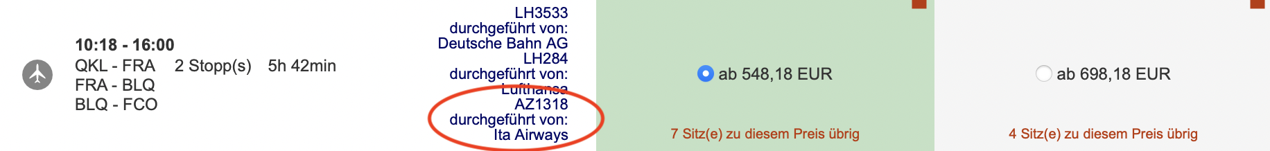 Dies ist mir durch Zufall aufgefallen und auch wenn die Webseite hier eine sehr unattraktive Verbindung ausweist, ist es durchaus interessant, dass man bereits jetzt ITA Airways Flüge bei Lufthansa findet.