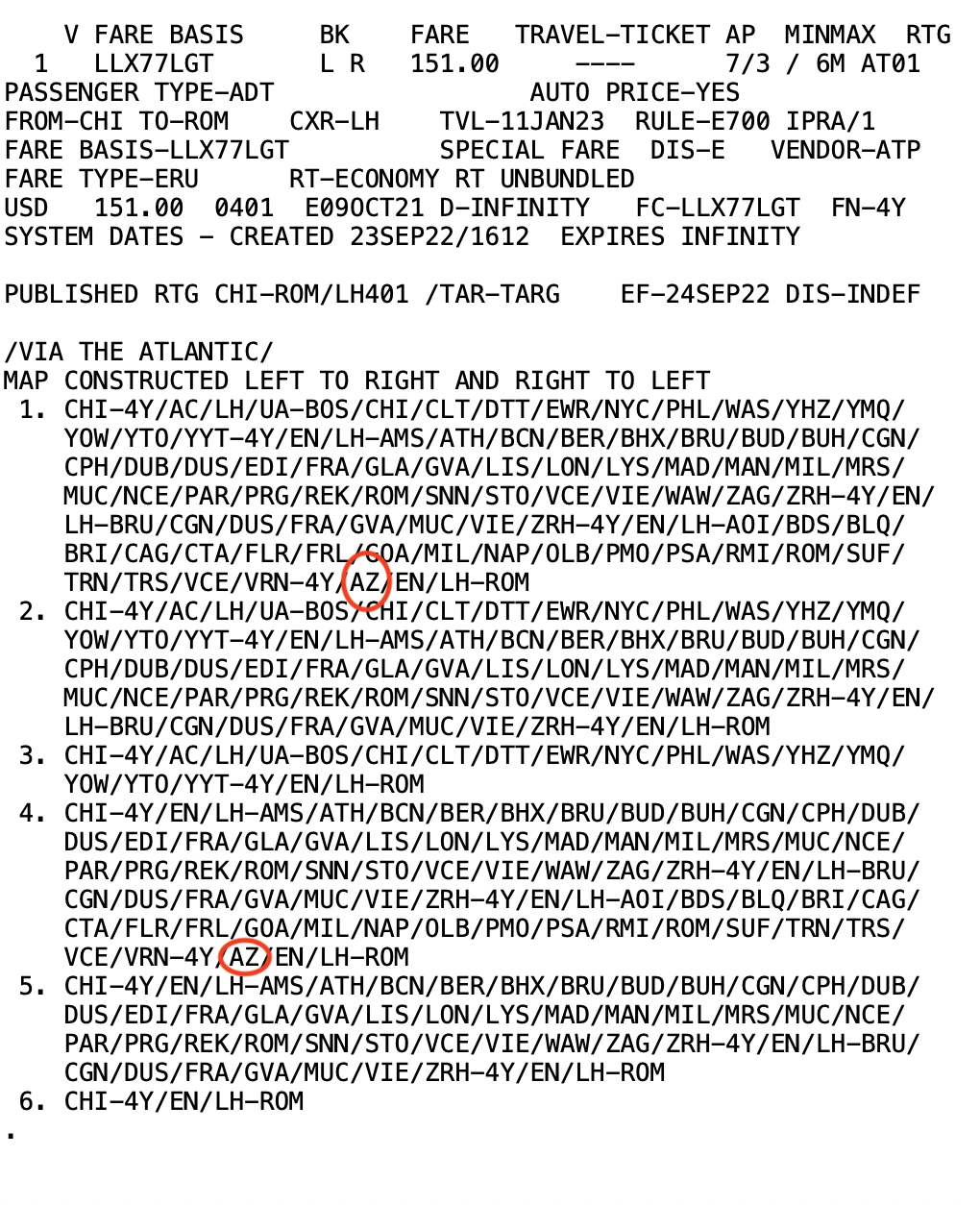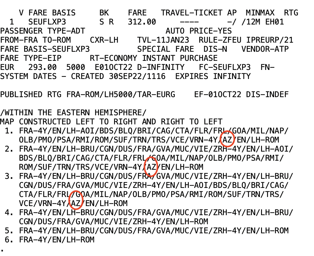 Auch wenn die Routing Regeln von Tarifen nicht einfach zu lesen sind, man sieht, dass man hier nun AZ Flüge erlaubt, was der Code von ITA Airways ist (und früher von Alitalia war).