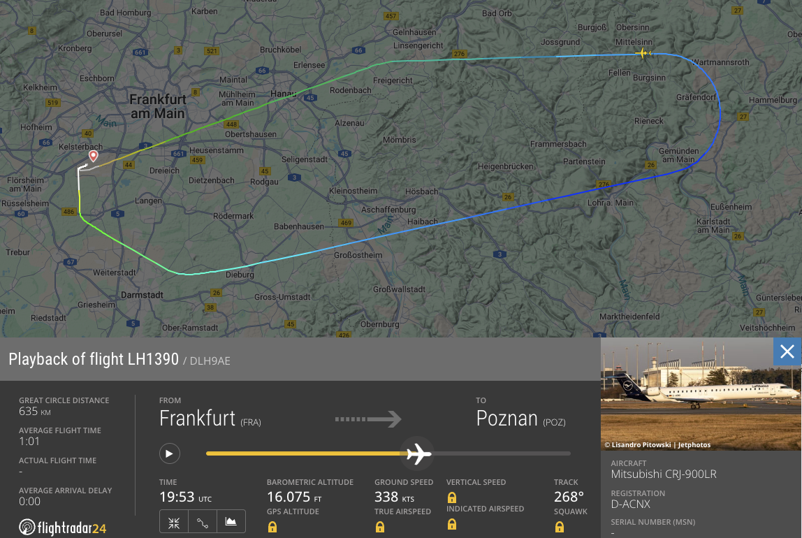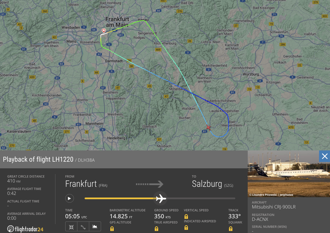Die Vorfälle betrafen die Lufthansa CityLine-Maschine mit dem Kennzeichen D-ACNX. Diese ist am Hub Frankfurt stationiert und fast 14 Jahre alt. Der 90-Sitzer wird üblicherweise auf kürzeren Europastrecken mit niedrigerem Aufkommen eingesetzt. Darunter sin u.a. Flüge von und nach Basel, Dresden, Stuttgart oder eben auch Posen und Salzburg wie in diesen Fällen: