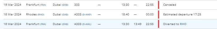 Zunächst sah es laut Flightradar24.com noch so aus, als würde es nach einem mehrstündigen Zwischenstopp in Griechenland noch am selben Tag mit einem Ersatzflugzeug nach Dubai weitergehen. Doch das passierte nicht. Die Passagiere wurden stattdessen in Hotels untergebracht und sollten am Folgetag ihren Weiterflug antreten. Unterdessen sagte Lufthansa den für den 19. März 2024 geplanten Umlauf des Flugs LH630 nach Dubai komplett ab.