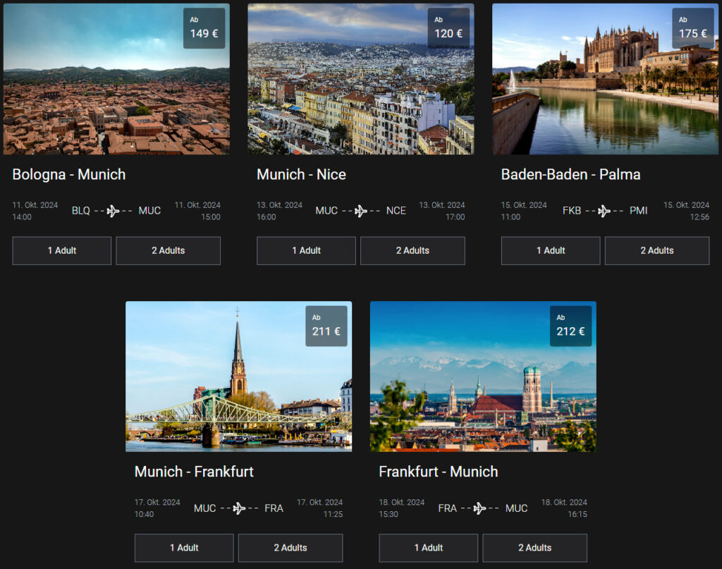 • Frankfurt (FRA) – München (MUC) am 18. Oktober für 212 Euro