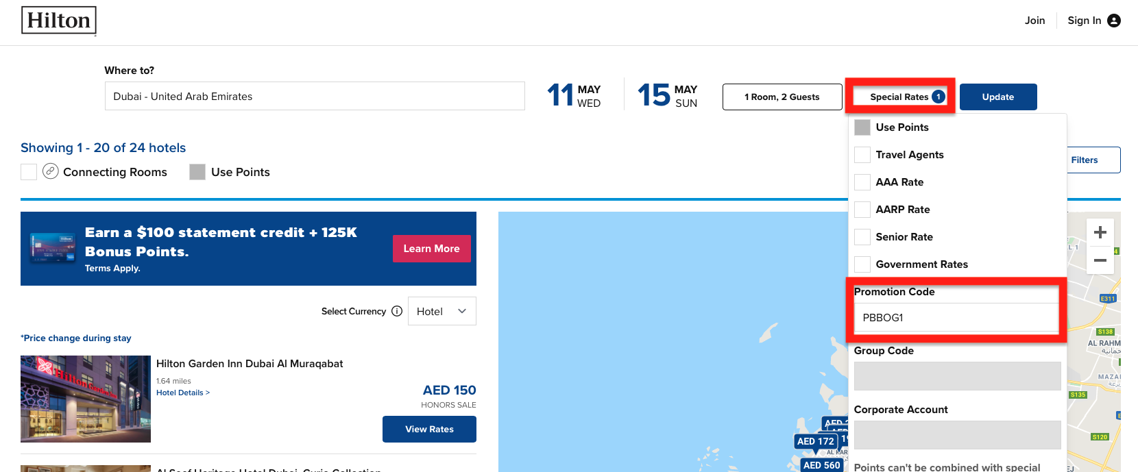 Um die Tarife bei Hilton angezeigt zu bekommen, müsst Ihr einen Promotion Code bei der Suche eingeben. Anschließend werden Euch in der Suche die reduzierten Raten angezeigt.