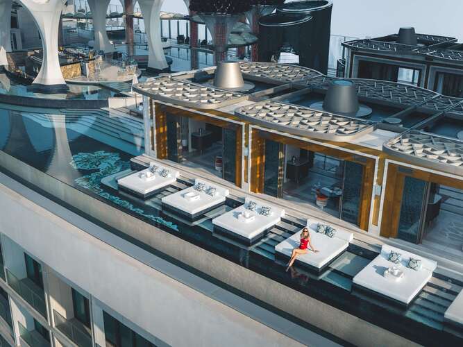 Aber auch wer keine Suite oder Villa mit privatem Pool im Atlantis The Royal bucht, der kann in einen der neun öffentlichen Pools entspannen und auch auf dem 91 Meter langen Infinity Pool auf dem Dach die spektakuläre Aussicht genießen.