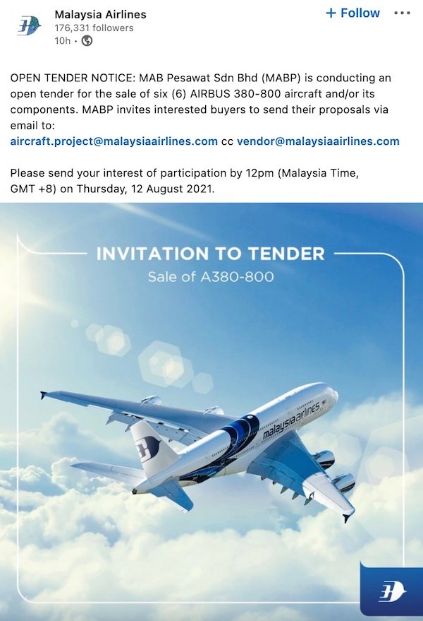 Nachdem eigentlich schon klar war, dass die Airbus A380 keine Zukunft mehr bei Malaysia Airlines haben werden, will man die Flugzeuge nun verkaufen. Hierbei ist der Markt für gebrauchte Airbus A380 aber so dünn, dass man sich zu einem sehr ungewöhnlichen Schritt entschlossen hat und den Airbus A380 öffentlich über Social Media zum Kauf anbietet. Alle Interessierten können sich per Mail bei der Airline melden.