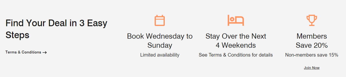 Bei den Marriott Bonvoy Escapes erhalten Mitglieder des Kundenbindungsprogramms Bonvoy 20% Rabatt auf Wochenend-Aufenthalte. Wer kein Bonvoy-Mitglied ist und dies auch nicht werden will, spart immerhin noch 15% auf die Standard-Zimmerrate. Wochenend-Aufenthalte sind dabei sind dabei als Zeitraum von Donnerstag bis Sonntag definiert, wobei bei einem Aufenthalt von Donnerstag auf Freitag auch die Freitagnacht gebucht werden muss. Im mittleren Osten gilt abweichend der Zeitraum von Mittwoch bis Samstag für die Aktion.