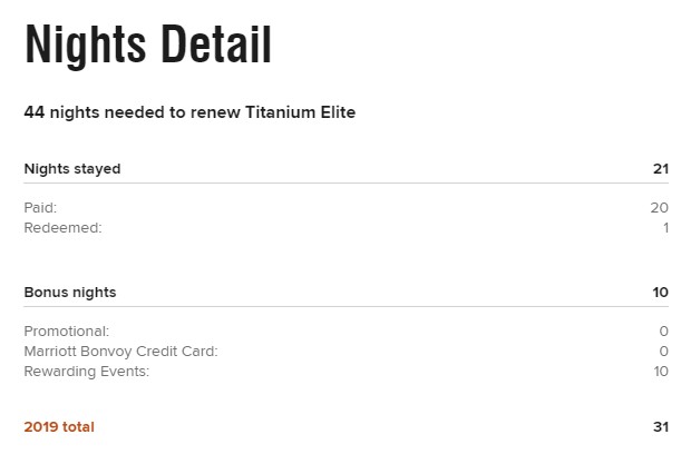 Ich habe in der Vergangenheit selber solche Aufenthalte gebucht. In diesem Jahr hatte ich Marriott Bonvoy zu Gunsten von Hilton und IHG eher den Rücken zugekehrt. Ich komme nur auf gut 30 Status-Nächte, hoffe aus der Vergangenheit jedoch darauf, von Titanium soft auf Platinum zu landen.