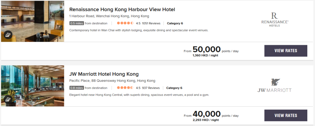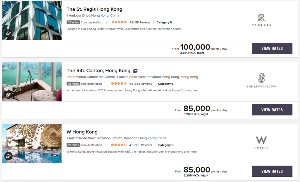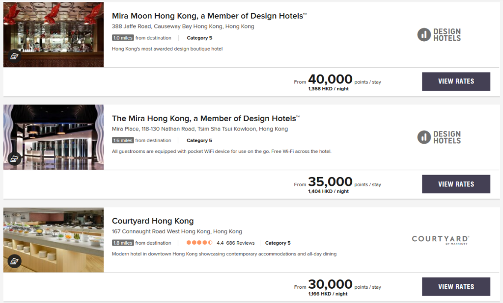 Ein anderer – im Augenblick allemal – interessanter Markt ist Hong Kong. Hier gibt es eine große Zahl von Bonvoy Hotels verschiedenster Marken in fast jedem Marktsegment. Durch die anhaltenden Proteste sind die Cash-Raten der Hotels stark unter Druck geraten. Daher könnte man für Punkteeinlösungen ähnliches erwarten. Allerdings sieht man hier ein wildes Nebeneinander von Peak, Standard und Off-Peak Raten.
