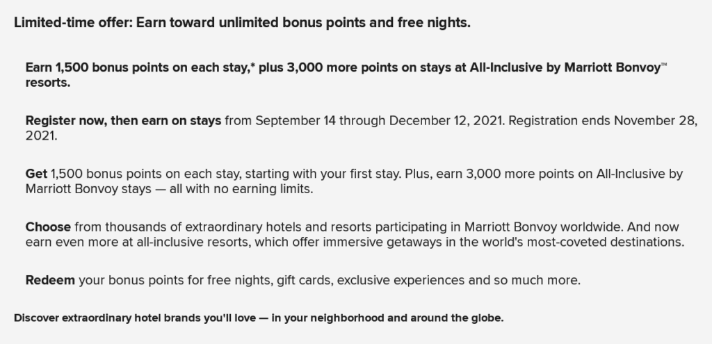 Die neue Promotion teilt alle Marriott Bonvoy Hotels in zwei Gruppen an. Dabei wird zwischen All-inclusive Resorts und Hotels unterschieden. In den All-inclusive Resorts gibt es 4.500 Bonuspunkte pro Aufenthalt, in den übrigen Hotels hingegen 1.500 Punkte.