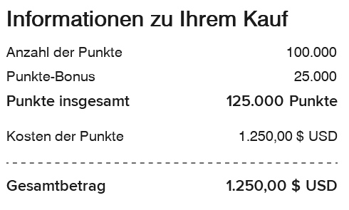- Punkte können in Schritten von jeweils 1.000 Punkten gekauft werden (die für dieses Aktionsangebot erforderliche Mindestanzahl beträgt 2.000 Punkte) oder in Schritten von jeweils 5.000 Punkten bis zu maximal 100.000 Punkten.