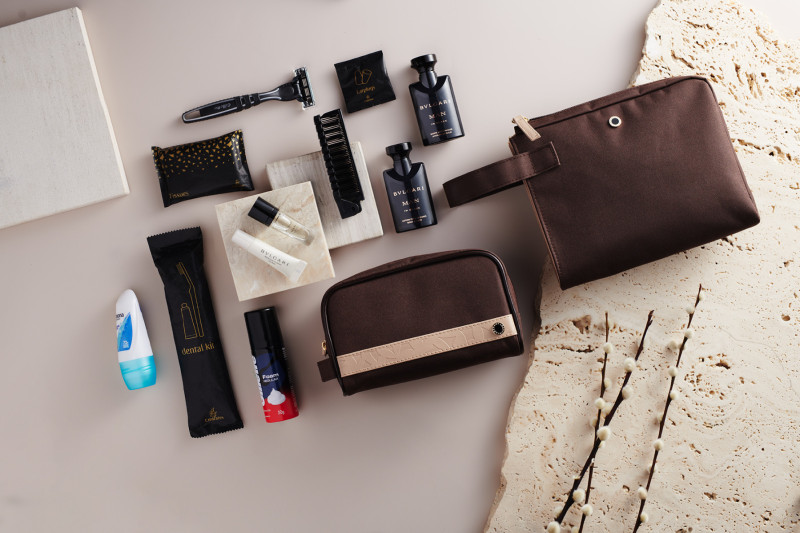 In der First Class gibt es je zwei individuelle Sammeltaschen für Damen und Herren, beide stehen in unterschiedlichen Formen zur Verfügung. Darunter eine klassische Kulturtasche und eine Handtasche für Männer, die mit weiteren Bulgari-Produkten bestückt wurden. Für Frauen wurden auch zwei Kits gestaltet, darunter eines in Form eines Kosmetikkoffers und die andere die Form einer Clutch.