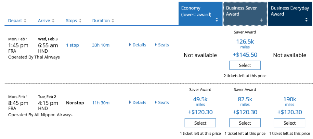 In die Zonen Nordasien und Japan kosteten Business Class Flüge vor den ganzen Erhöhungen 75k Meilen. Innerhalb von 30 Tagen vor Abflug zahlt man jetzt 86,5k Meilen. Bei längerfristiger Vorausbuchung immerhin noch 82,5k.