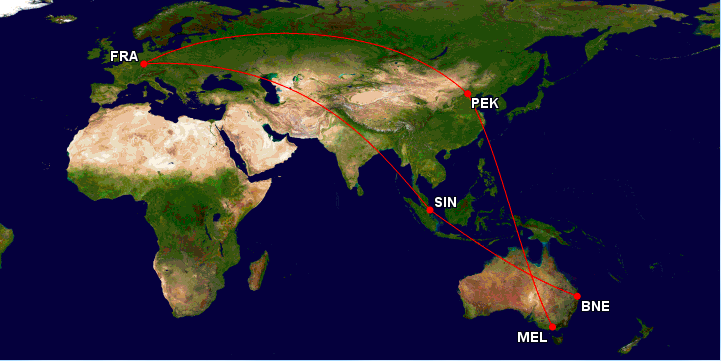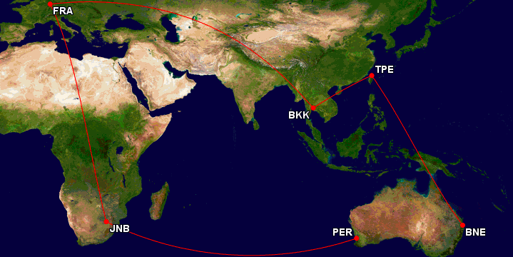 Werden mit BNE (Australien), TPE (Ostasien), BKK (Südostasien), FRA (Europa) nicht 4 Regionen berührt?