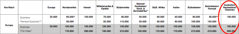 Wie bei Hawaii auch, gelten diese Werte für Australien allerdings nur für Direktflüge aus Europa nach Australien! Da es diese Flüge momentan allerdings nicht gibt, sind wir gezwungen in einer weiteren Zone umzusteigen, weshalb ein Drei- Zonen Award immer Anwendung bei Prämienflügen nach Australien findet.