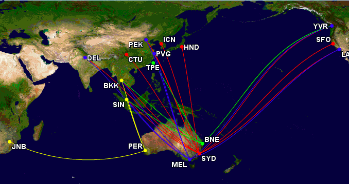 Nachdem wir so oder so einen 3 Zonen Award buchen müssen um nach „Down Under“ zu reisen, schauen wir uns am besten die Star Alliance Verbindungen nach Australien an. Dabei gibt es im wesentlichen Flüge nach Perth, Melbourne, Sydney und Brisbane. Von Singapur gibt es allerdings auch noch Flüge nach Adelaide und Canberra.