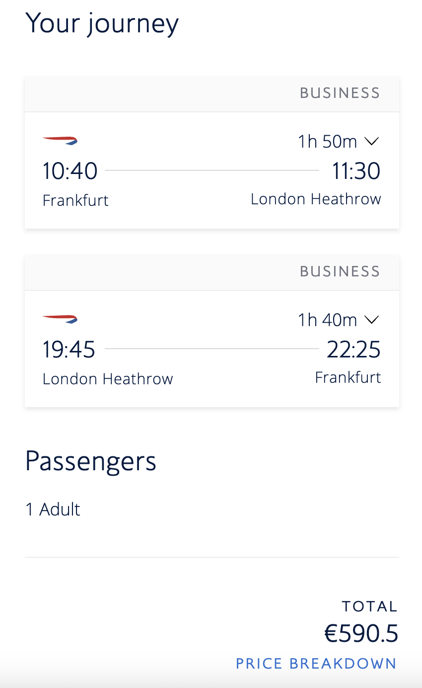 London ist hervorragend an Deutschland angebunden, täglich gibt es zahlreiche Direktverbindungen. Auch wenn der Flug nur rund 90 Minuten dauert. Wenn es schon Luxus sein soll, dann muss es auch ein Flug in der Business Class sein, doch ein regulär gebuchter Flug mit British Airways hätte knapp 600 Euro gekostet. Sicherlich ein normaler Preis für diese Flüge, aber eine Stange Geld!