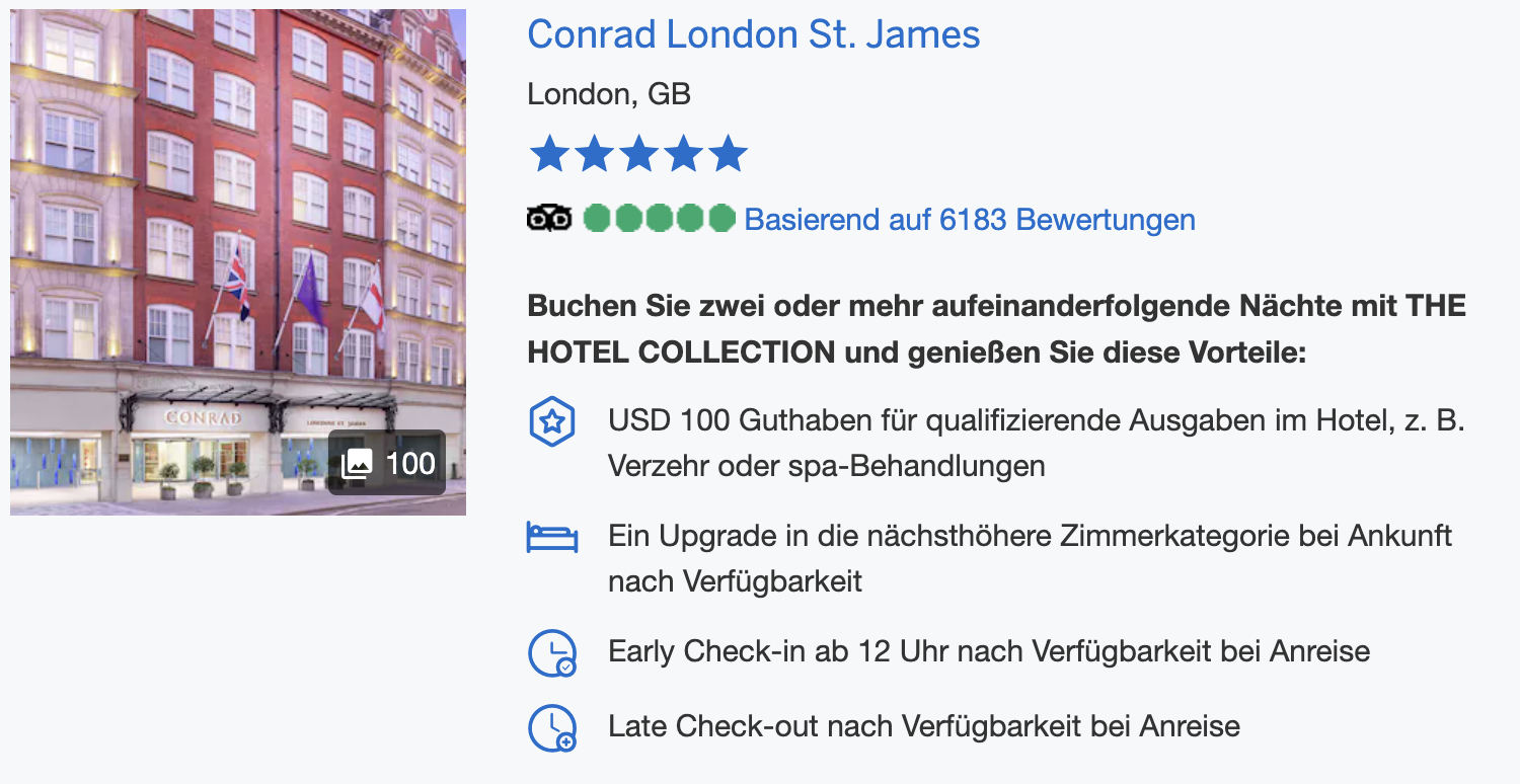 Einige Häuser wie das Conrad lassen sich im Rahmen des „Fine Hotels + Resorts“- oder „The Hotel Collection“-Programms buchen. Diese Reservierungen beinhalten Vorteile wie Zimmer-Upgrade, Late Check-out und ein 100 US-Dollar Guthaben z. B. für Speisen und Getränke. Ein solches Paket ist besonders interessant für alle ohne Hotelstatus, wobei alle Vorteile zusätzlich zu den Vorteilen eines Status im Hotel gelten!