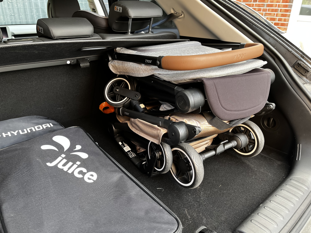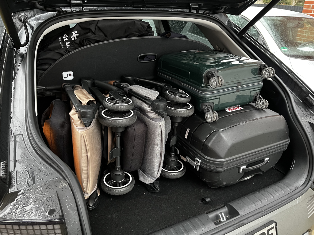 Während die beiden Joolz AER+ Buggies ursprünglich für ein bequemes Reisevergnügen am Flughafen gedacht waren, begleiten sie uns mittlerweile in vielen Lebenslagen. Schon auf dem Weg zum Flughafen sind wir mittlerweile deutlich flexibler geworden. Während unser Zwillingskinderwagen den Kofferraum unseres Tiguan Allspace schon komplett blockiert, können wir mit den beiden Joolz AER+ auch auf eines der kleineren Fahrzeuge zurück greifen. So passen beide Kinderwagen locker mit mehreren Handgepäckstücken auch in den Kofferraum des Hyundai IONIQ 5. Das umständliche Be- und Entladen schwerer Kinderwagen entfällt komplett. Die AER+ lassen sich locker mit einer Hand verladen.