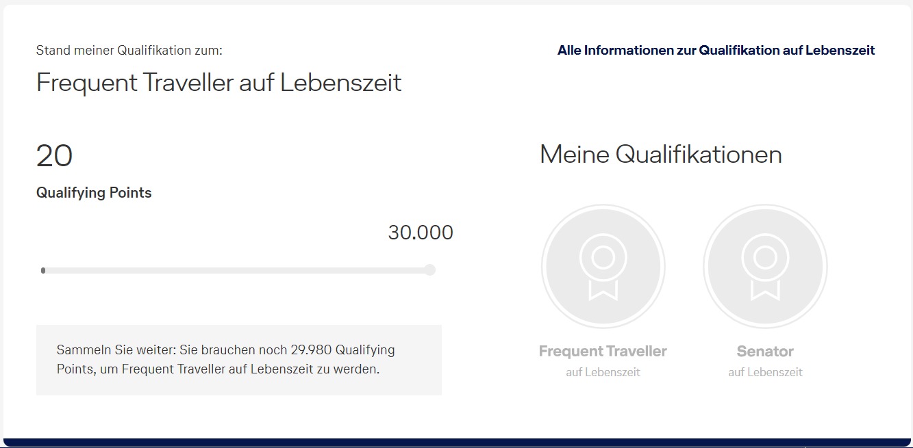 Miles and More hat Wort gehalten. Ab sofort könnt Ihr Euch in Eurem Nutzerkonto informieren, wie viele Qualifying Points Ihr schon für den Lifetime Frequent Traveller oder den Lifetime Senator gesammelt habt.