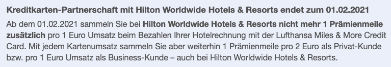 Für uns und den User ist vor allem entscheidend, dass die Möglichkeit der erhöhten Meilengutschrift bei Hilton wegfällt.