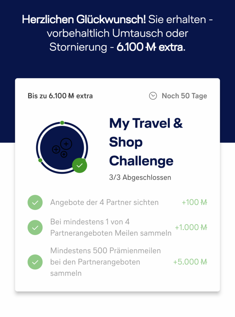 Seit Dezember gibt es auch die My Travel & Shop Challenge, dabei kann man in drei Stufen bis zu 6.100 Meilen extra sammeln. Es geht darum, bei einem von vier Shops etwas zu kaufen und Meilen zu sammeln: