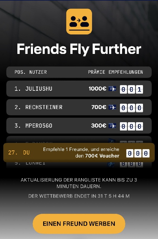 Ein lukratives zusätzliches Feature ist die Freundschaftswerbung, die nun mit zusätzlichen Prämien extra belohnt wird. Neben Lufthansa Fluggutscheinen könnt Ihr Euch wieder auch besondere Sammelkarten sichern. Meldet sich ein neuer Nutzer mit Eurem Werbecode an und scannt seine erste Bordkarte, könnt Ihr Euch eine aus vier zufälligen Sammelkarten auswählen. Parallel erhält auch der geworbene Freund eine zusätzliche Sammelkarte.