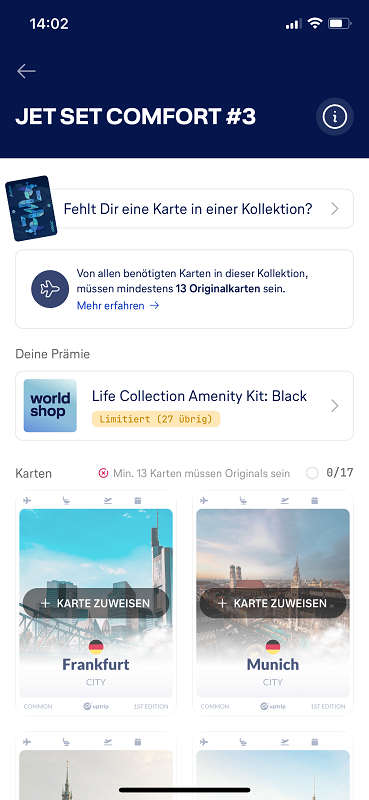 Das Sortiment an neuen Kollektionen ist in letzter Zeit sehr ähnlich. Mal wieder gibt es ein Gewinnspiel mit einer Chance auf Sitzplätze im Lufthansa Community-Flug. Leider, aber natürlich, nur in der Economy Class, da Miles & More es schwer haben dürfte, hier die Plätze zu füllen. Auch das Amenity Kit aus der Lufthansa Life Collection ist mittlerweile ein bekannter Artikel, der aber auch sehr schnell vergriffen sein dürfte. Und das, obwohl die Anforderungen so hoch sind. Man merkt, dass die Verantwortlichen bei UpTrip genau wissen, welche Sammelkarten häufig im Umlauf sind und welche Ladenhüter sind.
