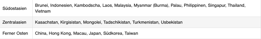 Hier einmal die 3 Miles&More Zonen in Asien und die dazugehörigen Länder.