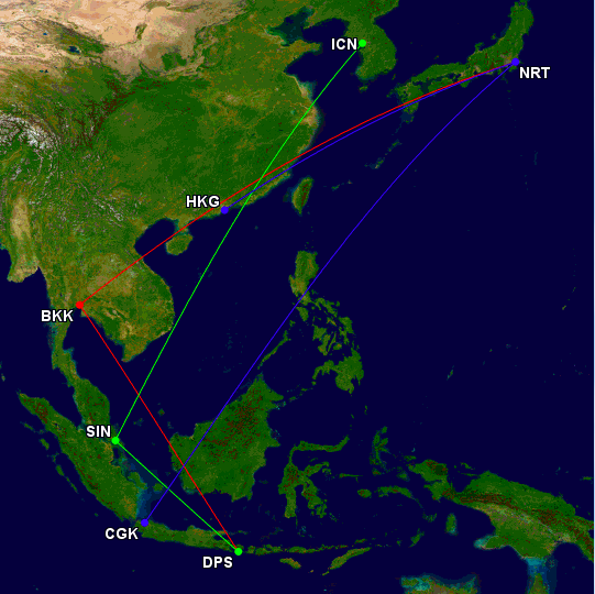- Jakarta-Tokyo- Hongkong (5.462 Meilen Flugstrecke)