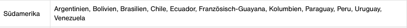 Hier einmal die Länder, welche zur Zone Südamerika gehören: