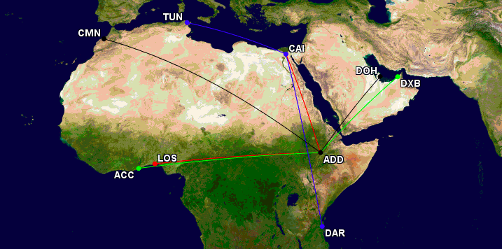Nicht nur, dass es eine Reihe von verschieden Zielen in dieser Zone gibt, mit zwei Star Alliance Hubs in Addis Abeba und Cairo, habt ihr auch sehr umfangreiche Optionen um Eurer Routing zu bauen und richtig viel zu fliegen!