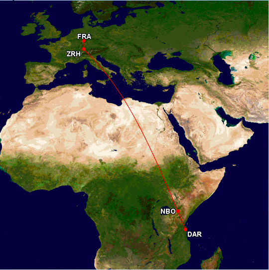 - Zürich- Dar es Salaam- Cairo-Dubai (8.283 Meilen Flugstrecke)