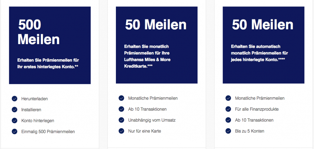 - Bis zu weitere 50 Prämienmeilen pro Monat, für das Hinterlegen von Bankkonten. Für jedes Konto, welches Ihr in der App hinterlegt und auf welchem Ihr mindestens 10 Transaktionen pro Monat habt, erhaltet Ihr je 10 Prämienmeilen pro Monat. Maximal werden für 5 Konten Prämienmeilen gutgeschrieben, also insgesamt 150 Prämienmeilen pro Monat.