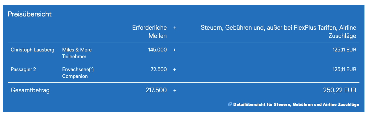 Buchen lassen sich die FlexPlus Prämien als Companion Award übrigens auch ganz einfach online über die Miles&More Webseite. Hierbei wird bei Senatoren und HON Circle Membern der Companion Award immer automatisch angewendet, auch bei einer FlexPlus Prämie.