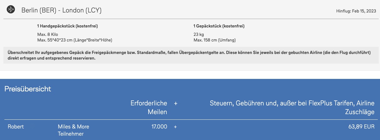 Der identische Trip ist für 17.000 Meilen und 63,89€ Zuzahlung zu haben- rechnerisch stehen die 17.000 Meilen in dem Fall einem Ticketpreis von 271€ gegenüber