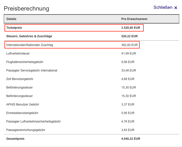 Im darauffolgenden Preisberechnungsfeld wird der Flugpreis aufgeschlüsselt. Für die Berechnung der Prämienmeilen sind der Ticketpreis und der internationale/ nationale Zuschlag relevant.