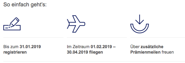 Die Aktion ist „personalisiert“ und beinhaltet für jedes Miles & More Mitglied ein personalisiertes Ziel, eine bestimmte Anzahl Statusmeilen im Zeitraum vom 1. Februar bis 30. April  2019 zu sammeln.