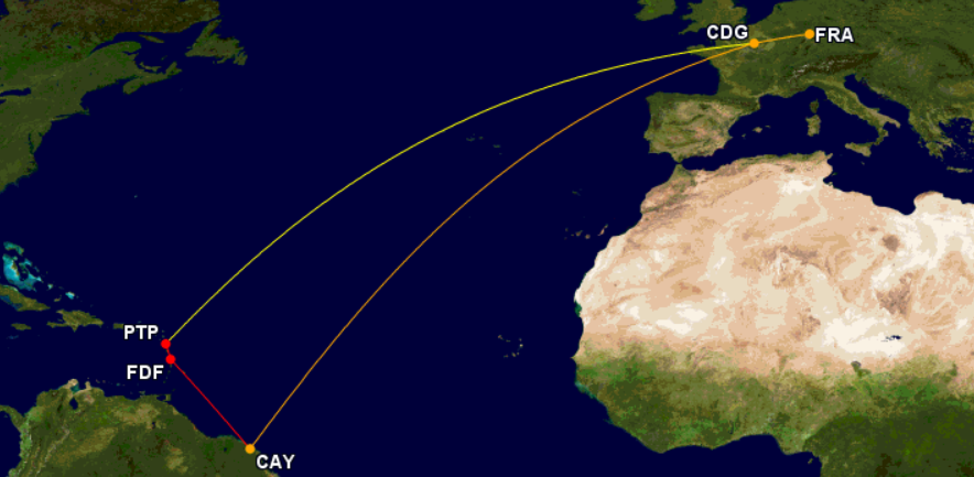 Frankfurt-Paris Charles de Gaulle – Point-à-Pitre, Guadeloupe – Fort-de-France, Martinique (nur im Flugzeug) – Cayenne, Französisch-Guayana – Paris Charles de Gaulle – Frankfurt