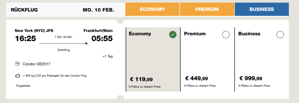 Beachten muss man bei diesen Tarifen, dass es sich um Light Tarife mit einem kleinen Handgepäcksstück handelt. Da man hier aber auch nur für eine Nacht nach New York reisen kann (wenn man denn möchte), kann dies durchaus in Frage kommen. Aber auch die Tarife mit Gepäck sind bei Condor nach Nordamerika gerade deutlich reduziert. Wer einen Koffer mit 23 Kg mitnehmen will, sollte hier mit einem Aufpreis von etwa 50 Euro pro Person und Strecke rechnen.