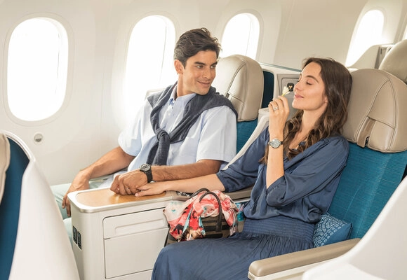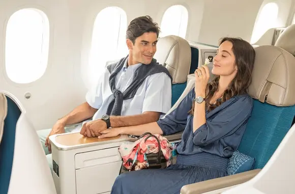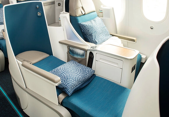 Air Tahiti Nui fliegt eine Flotte aus modernen Boeing 787-9. Als Airline mit Fokus auf Urlaubsreisen hat man auch eine hierzu passende Business Class mit 2-2-2 Anordnung verbaut. Die Sitze lassen sich hier alle in ein flaches Bett verstellen, sind aber besonders für Paare sehr gut geeignet.