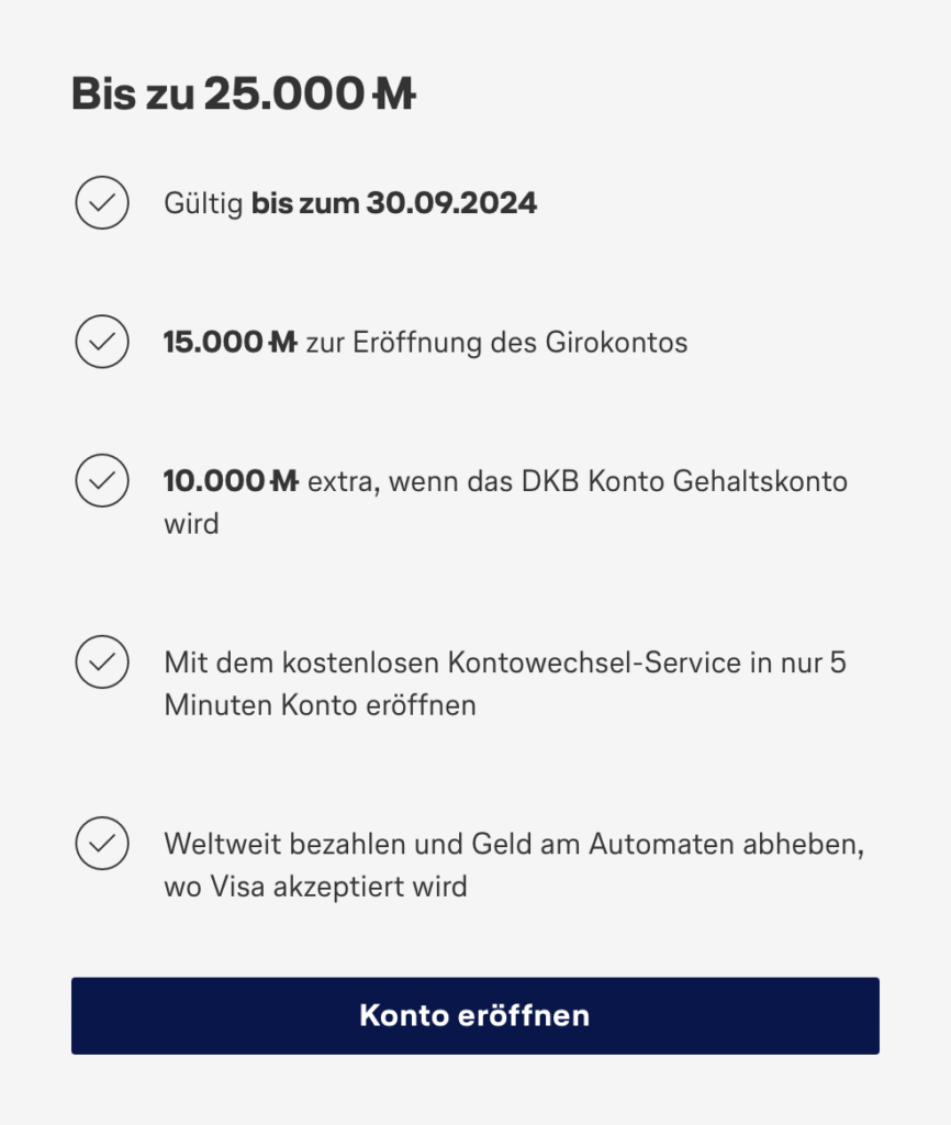 Alleine für die Eröffnung des DKB Girokontos erhaltet Ihr aktuell 15.000 Prämienmeilen gutgeschrieben. Weitere 10.000 Prämienmeilen erhaltet Ihr, wenn Ihr das Konto als Gehaltskonto einrichtet, sodass hier in Summe 25.000 Prämienmeilen bis zum 30. September gesammelt werden können.