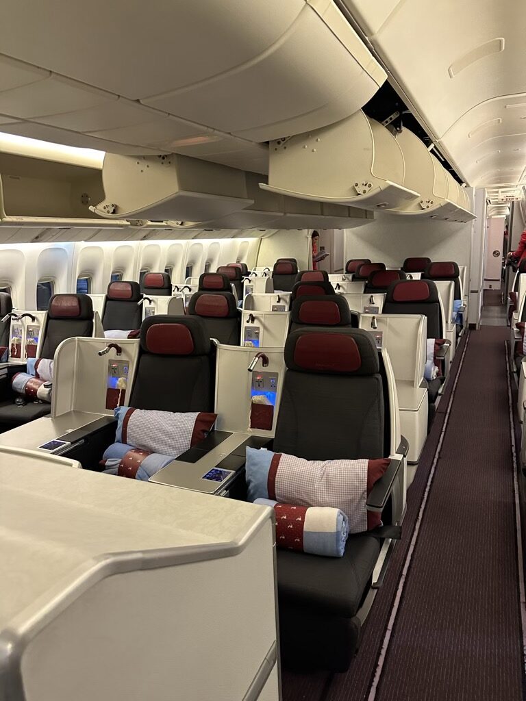 Die Boeing 777-200ER von Austrian bietet Platz für 330 Passagiere. Die Mehrheit der 258 Sitze befindet sich in der Economy Class, während die Premium Economy Class seit Januar 2023 über 40 zusätzliche Sitzplätze verfügt. Im vorderen Teil des Flugzeugs befindet sich eine Business Class mit Lie-Flat-Sitzen für bis zu 32 Fluggäste. Diese Konfiguration mit 5-6 Sitzen pro Reihe bietet sowohl Alleinreisenden als auch Paaren ein angenehmes Flugerlebnis.