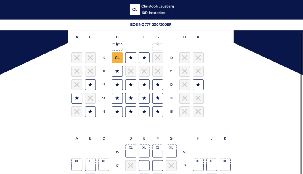 Beachtet, dass die Premium-Economy-Class-Sitze nicht als solche gekennzeichnet sind, sondern auf dem Sitzplan in der normalen Economy-Class-Kabine mit einer 2-4-2-Anordnung in den Reihen 10 bis 15 erscheinen.