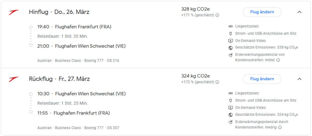Diesen zusätzlichen Komfortgewinn könnt Ihr nun wieder an zwei Tagen im März erfahren. Denn am 26. (Donnerstag) und 27. März (Freitag) fliegt Austrian mit einem Widebody von Schwechat nach Frankfurt. Dabei müsst Ihr genau darauf achten, dass Ihr den richtigen Flug des Tages erwischt. Denn die Österreicher fliegen teilweise im Stundentakt nach Frankfurt. Außerdem sind es an den beiden Tagen unterschiedliche Flüge zu anderen Tageszeiten, auf denen die Boeing 777 eingesetzt wird.