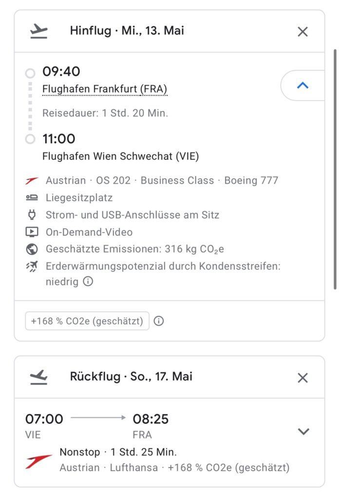 Wenn ich an einem der geplanten Tage zwischen den Städten reisen müsste, würde ich auf jeden Fall den Flug in der Boeing 777 von Austrian bevorzugen.