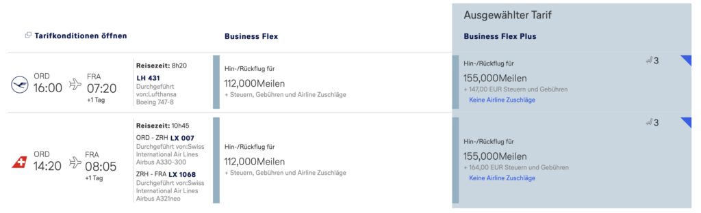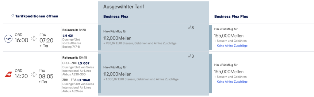 Bei einem einfachen Business Class Flug in der Lufthansa Business Class von Frankfurt nach Chicago, fallen inzwischen 112.000 Meilen und satte 983 Euro an Steuern und Gebühren an. Fliegt man mit einer Umsteigeverbindung, steigen die Kosten sogar schnell auf über 1.000 Euro, was absurde Werte sind.
