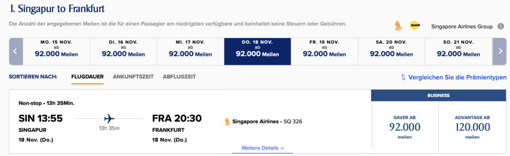 Ganz günstig ist dieses Round the World Routing in der Business Class also nicht, denn insgesamt fallen 263.000 KrisFlyer Meilen an. Dafür sind die Steuern und Gebühren mit knapp 120 Euro für alle Flüge sehr gering.
