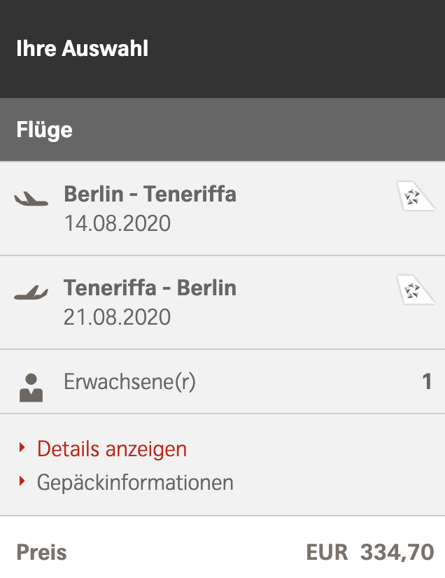Stellenweise gibt es sogar noch sehr kurzfristige Verfügbarkeiten, beispielsweise von Berlin über Zürich nach Teneriffa. In unserem Beispiel geht es schon am 14. August los. Der frühe Abflug ab Zürich macht allerdings einen Zwischenstopp mit Übernachtung nötig.