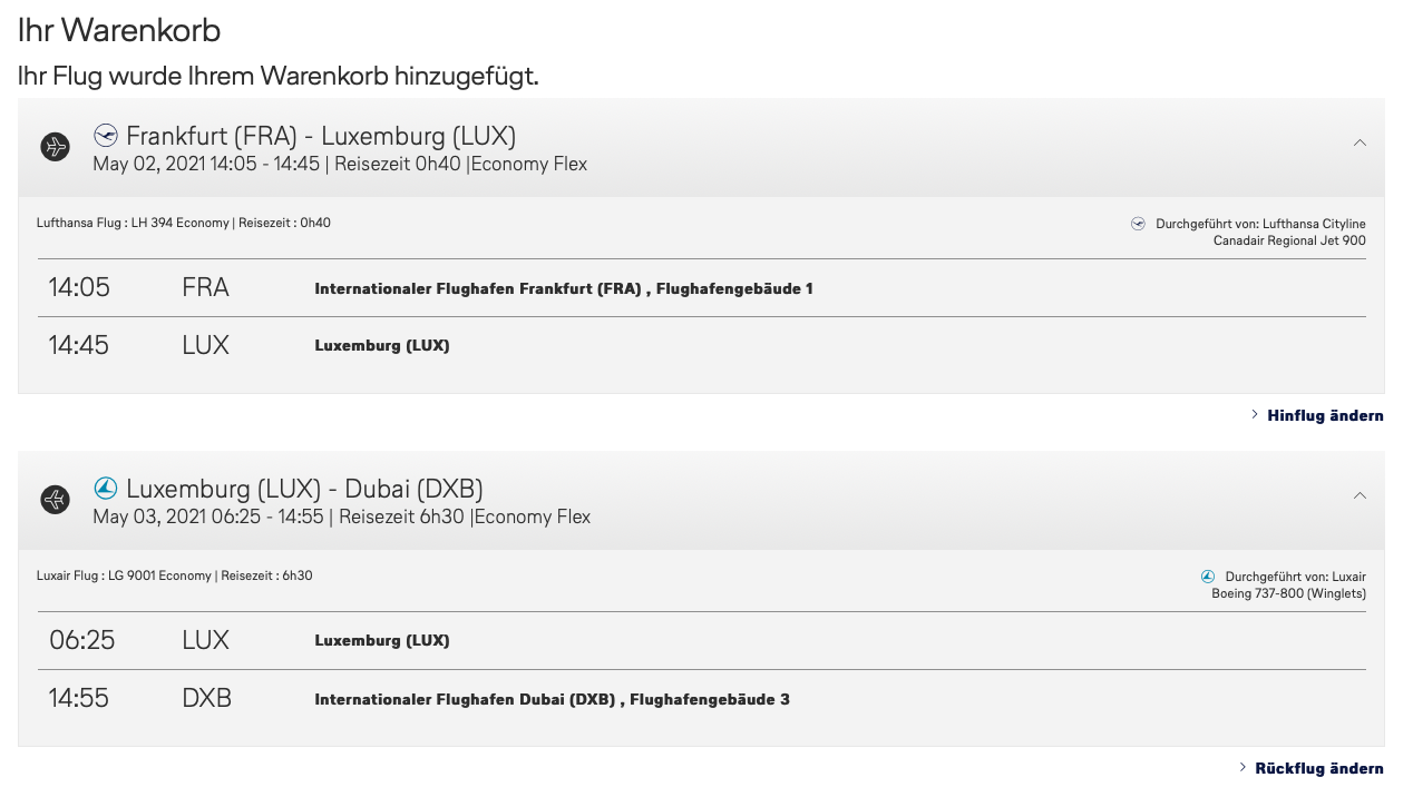 Der Rückflug aus Dubai nach Luxemburg, lässt sich auch als one way buchen: