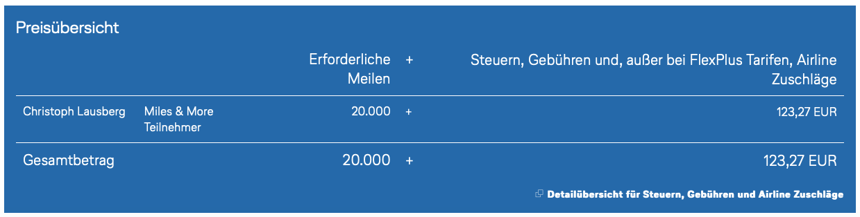 Die Steuern und Gebühren ab Dubai sind etwas höher, was an den etwas höheren lokalen Airport Gebühren liegt, aber dennoch ist ein Hin- und Rückflug spektakulär günstig zu haben und vermutlich die günstigste Option, welche das Miles&More Program zu bieten hat, zumindest wenn man sich auf den Cash Anteil bezieht.